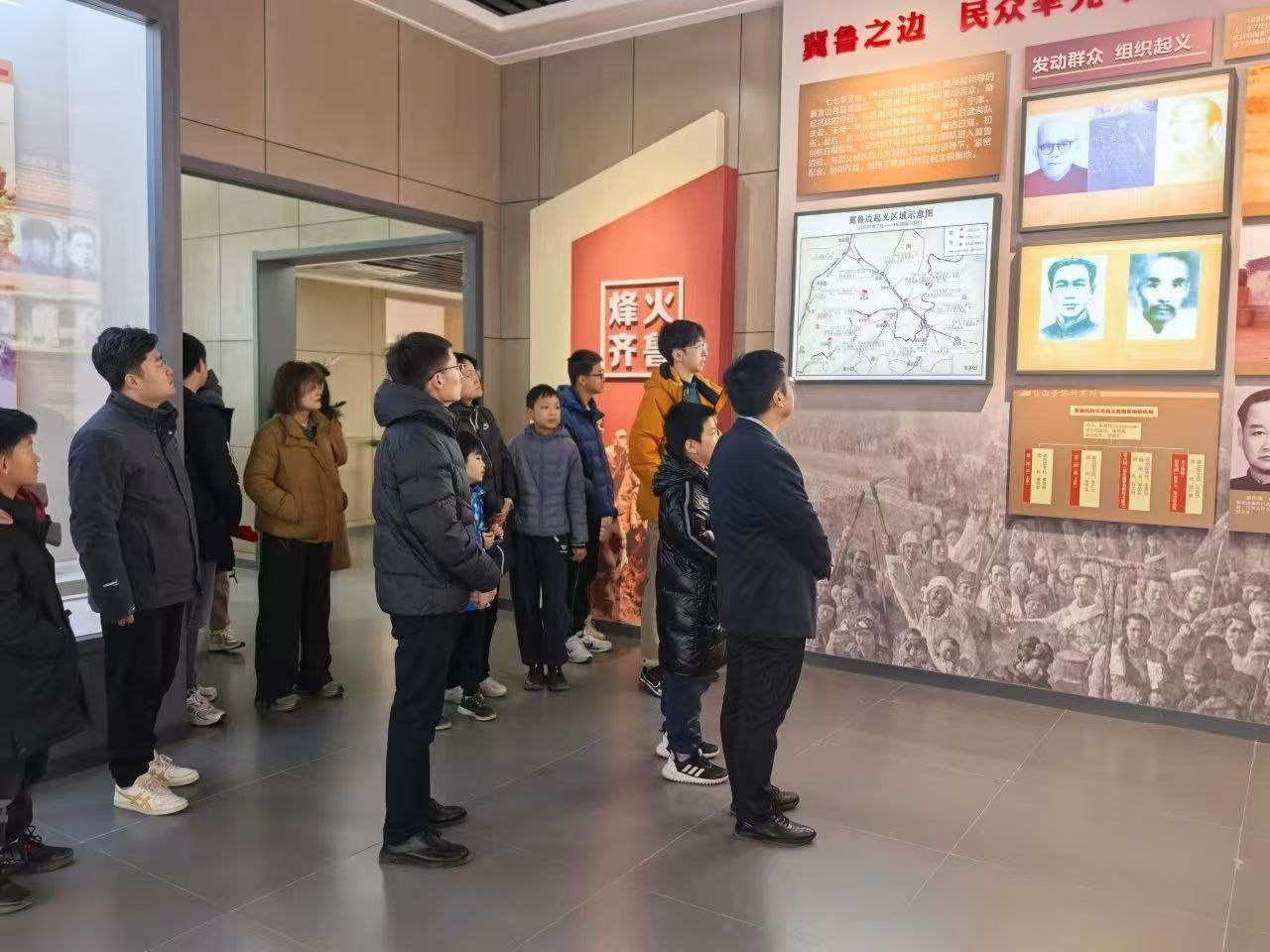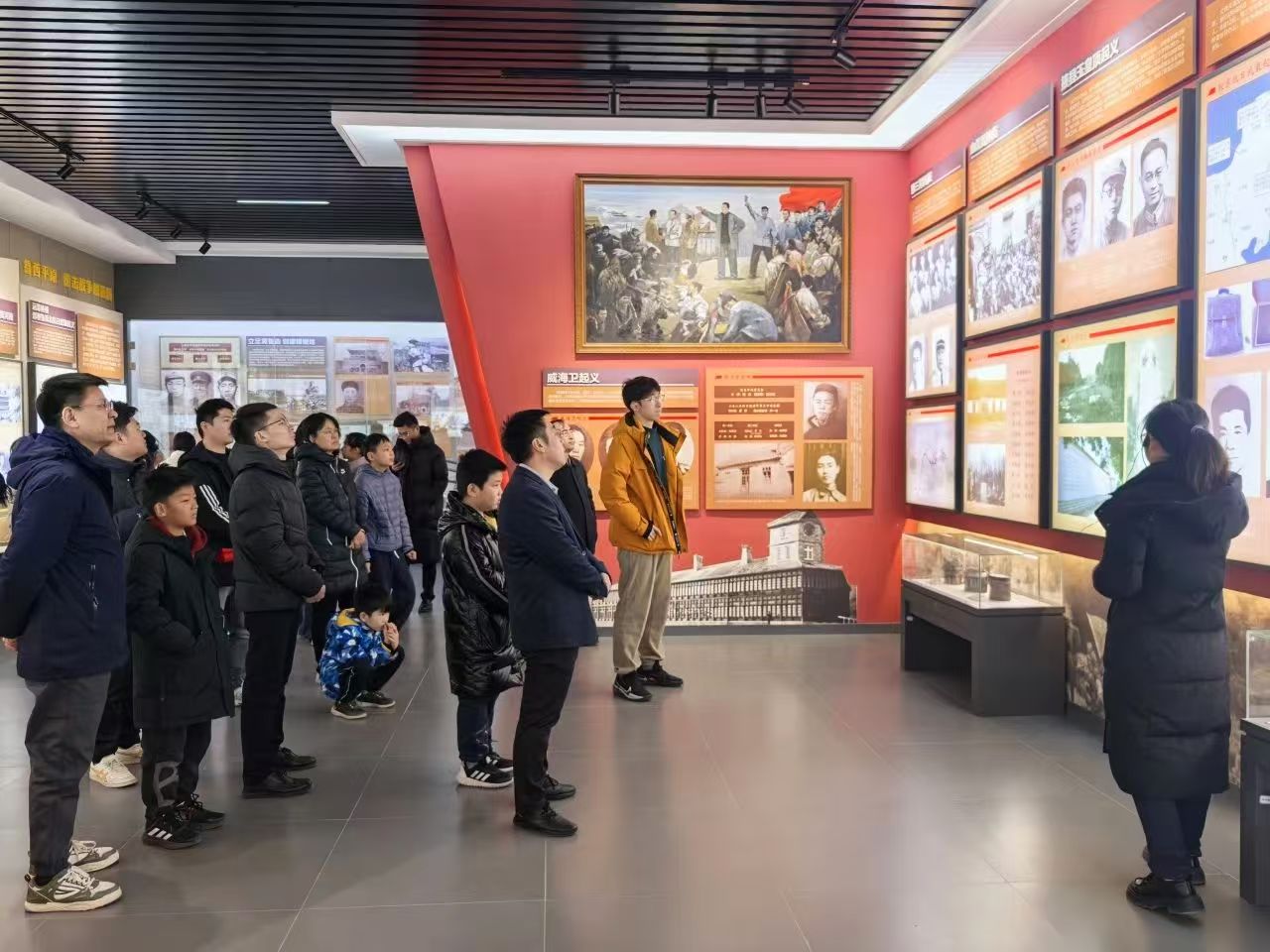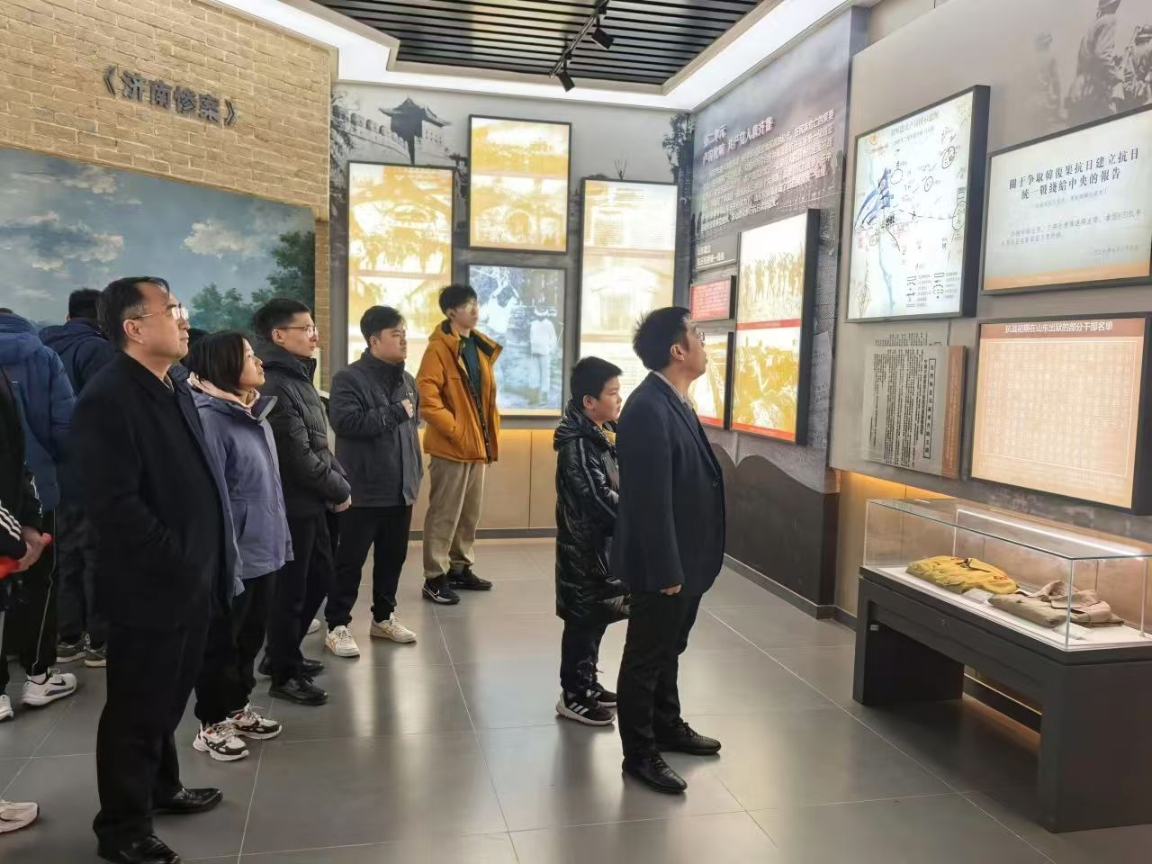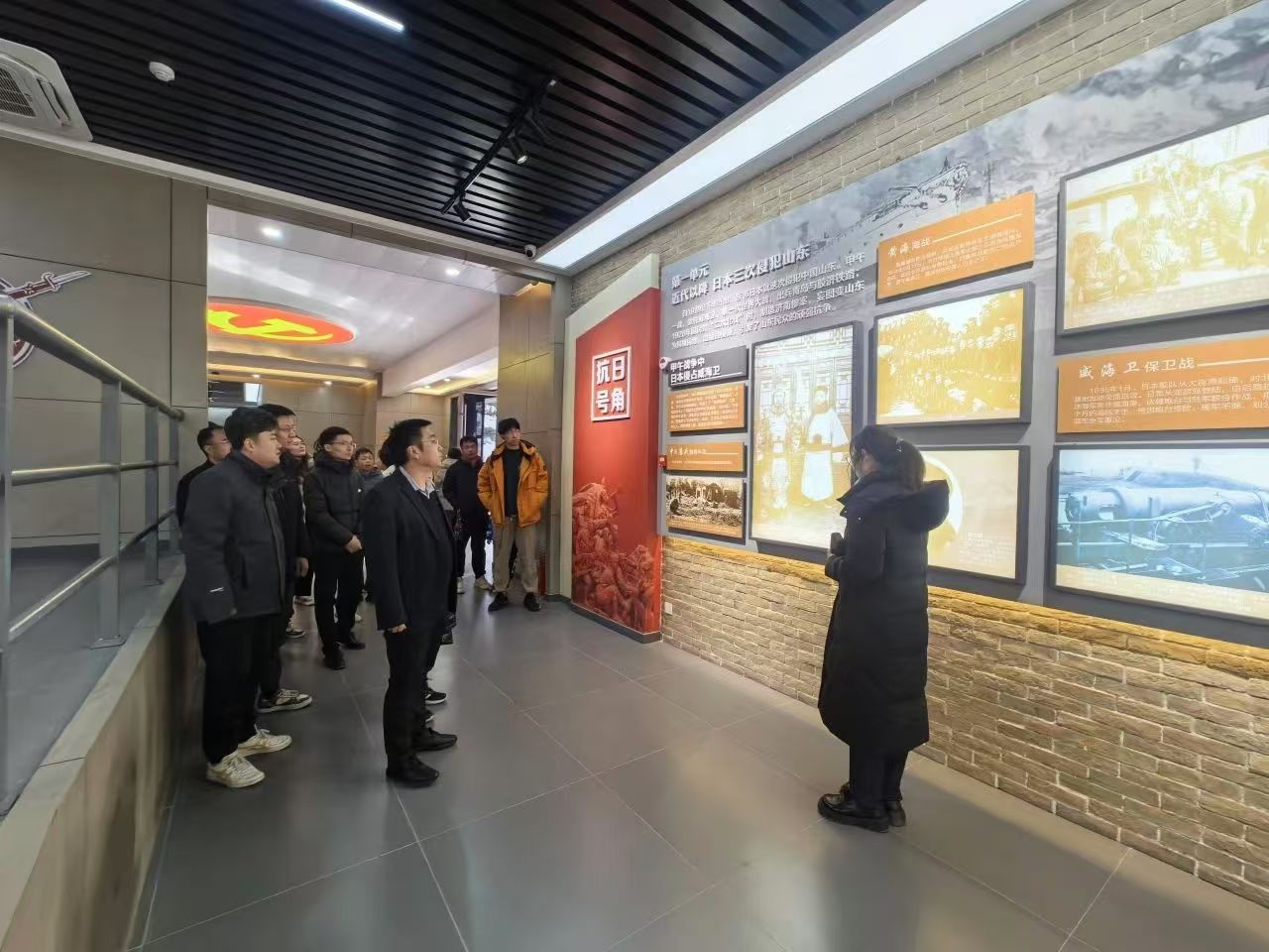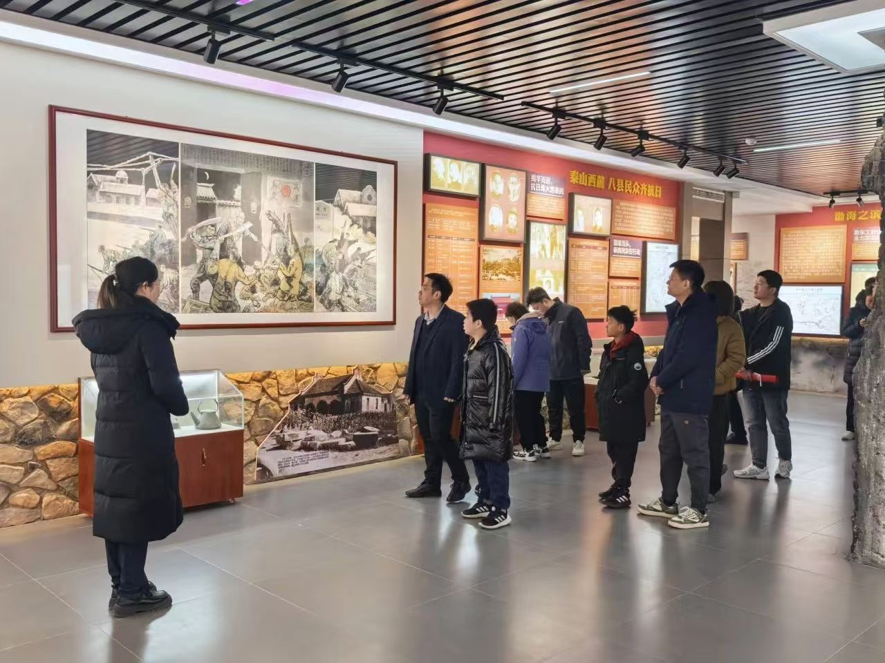在徂徕山抗日武装起义纪念馆内,党员们认真聆听讲解员讲述起义事件的完整经过。